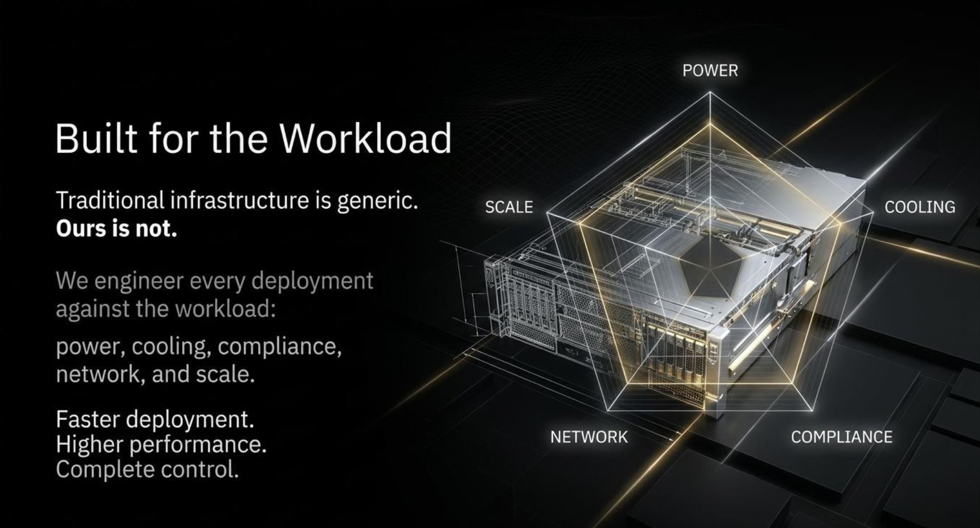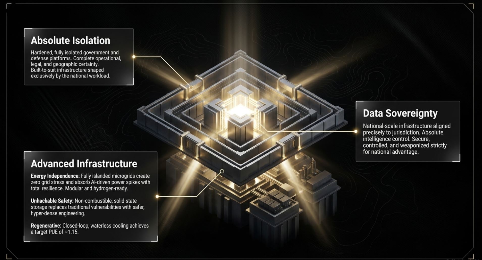 Haedened, fully isolated government, and defense platforms. Complete operational, legal, and, geographic certainty. Built-to-suit infrastructure shaped exclusively by the national workload.